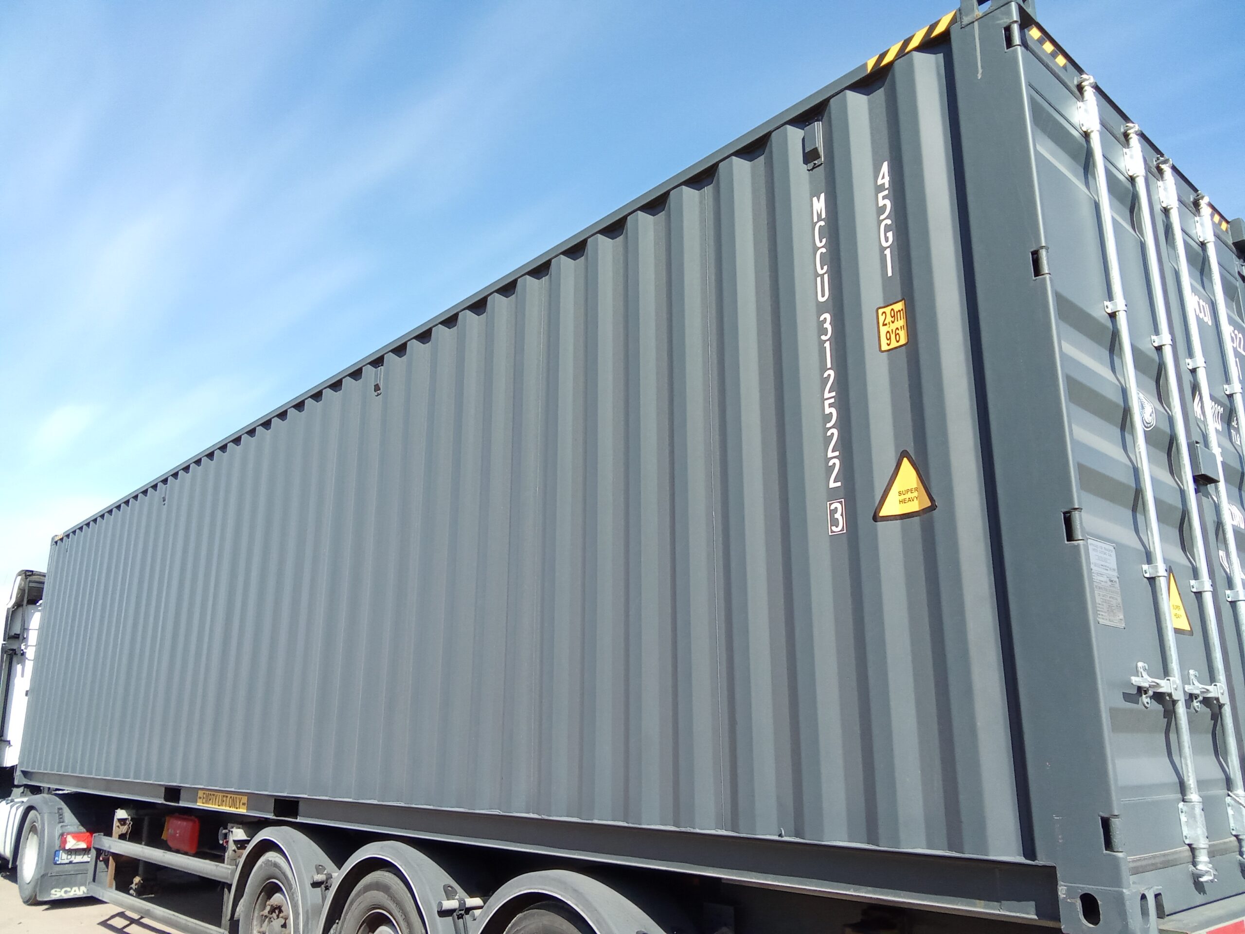 - 40-stopowe kontenery typu High Cube – mają dodatkową wysokość (w porównaniu do standardowych kontenerów), co zapewnia więcej przestrzeni w pionie i jest szczególnie przydatne przy transporcie lub magazynowaniu wysokich ładunków.